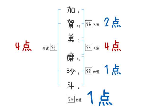外運![]() | 加賀美磨沙斗さんの外運は29画の4つ星!完全主義で才能がある。厳格な心の持ち主。 生活面を象徴する運勢です。外部から受ける影響力を表し、結婚運、家庭運や職場、環境への順応性を表します。 |