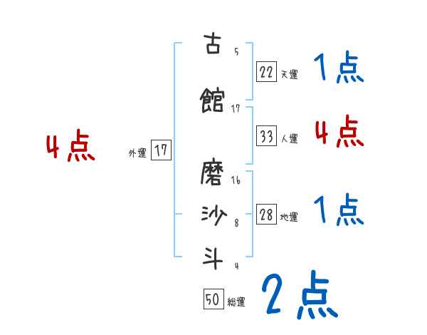 天運![]() | 古館磨沙斗さんの天運は22画の1つ星!努力することが苦手ないっぽう手先が器用。芸術性にも優れる。 家系が持つ宿命的な運勢を表します。祖先から受け継いだ苗字ですので自分の力が及びません。家柄を象徴します。 |