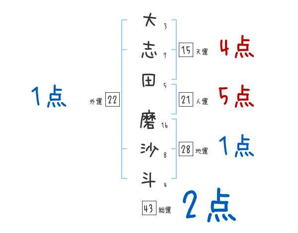 天運![]() | 大志田磨沙斗さんの天運は15画の4つ星!人徳があり出世する。順調に物事を進め円満な人生。 家系が持つ宿命的な運勢を表します。祖先から受け継いだ苗字ですので自分の力が及びません。家柄を象徴します。 |