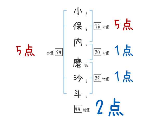 天運![]() | 小保内磨沙斗さんの天運は16画の5つ星!人望が厚く大きく発展する。逆転成功が見える。 家系が持つ宿命的な運勢を表します。祖先から受け継いだ苗字ですので自分の力が及びません。家柄を象徴します。 |