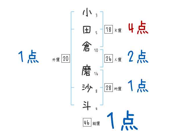 天運![]() | 小田倉磨沙斗さんの天運は18画の4つ星!情熱的で剛気。忍耐力があり信頼される。 家系が持つ宿命的な運勢を表します。祖先から受け継いだ苗字ですので自分の力が及びません。家柄を象徴します。 |
