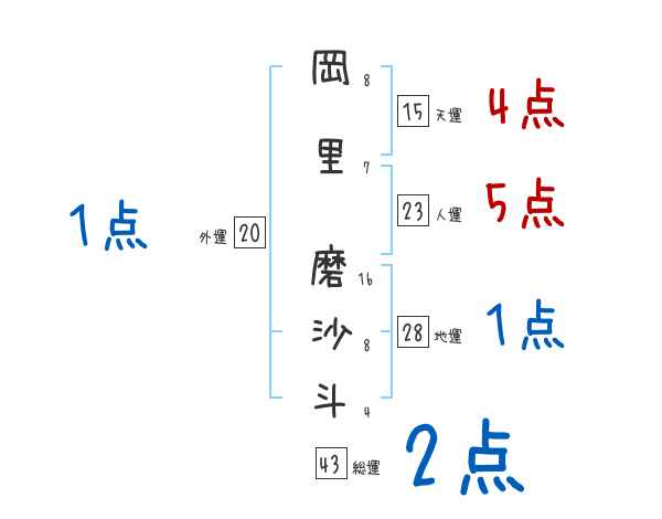 人運![]() | 岡里磨沙斗さんの人運は23画の5つ星!想像力に優れ活力がある。一代で成功し名誉を手に入れる。 性格や才能などを表す2番目に重要な運勢です。人間関係や協調性、社会的な成功に影響します。主に20歳から50歳ぐらいまでの中年期の運勢を表します。 |