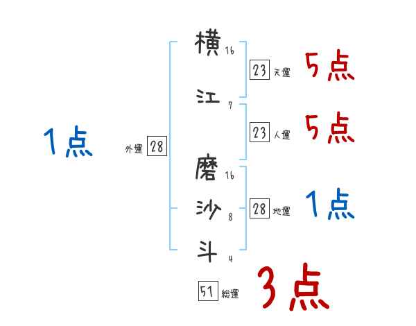 地運![]() | 横江磨沙斗さんの地運は28画の1つ星!家庭環境に注意。スポーツで活躍できる能力があるかも。 個性を表す基礎的な運勢です。性格形成や対人関係、行動力など家庭環境に影響されます。主に誕生してから20歳くらいまでの若年期の運勢を表します。 |