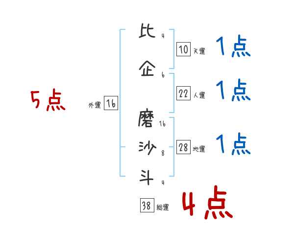 外運![]() | 比企磨沙斗さんの外運は16画の5つ星!人望が厚く大きく発展する。逆転成功が見える。 生活面を象徴する運勢です。外部から受ける影響力を表し、結婚運、家庭運や職場、環境への順応性を表します。 |