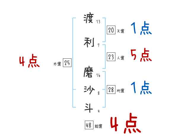人運![]() | 渡利磨沙斗さんの人運は23画の5つ星!想像力に優れ活力がある。一代で成功し名誉を手に入れる。 性格や才能などを表す2番目に重要な運勢です。人間関係や協調性、社会的な成功に影響します。主に20歳から50歳ぐらいまでの中年期の運勢を表します。 |