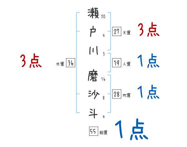 瀬戸川磨沙斗さんの画数の鑑定結果
