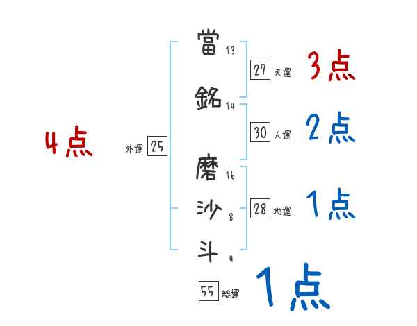 天運![]() | 當銘磨沙斗さんの天運は27画の3つ星!頭脳明晰だが強情で摩擦が多い傾向。孤立に注意。 家系が持つ宿命的な運勢を表します。祖先から受け継いだ苗字ですので自分の力が及びません。家柄を象徴します。 |