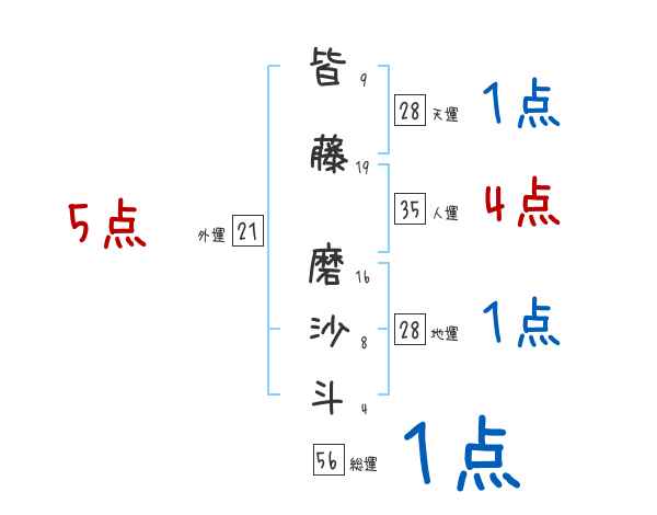 天運![]() | 皆藤磨沙斗さんの天運は28画の1つ星!家庭環境に注意。スポーツで活躍できる能力があるかも。 家系が持つ宿命的な運勢を表します。祖先から受け継いだ苗字ですので自分の力が及びません。家柄を象徴します。 |