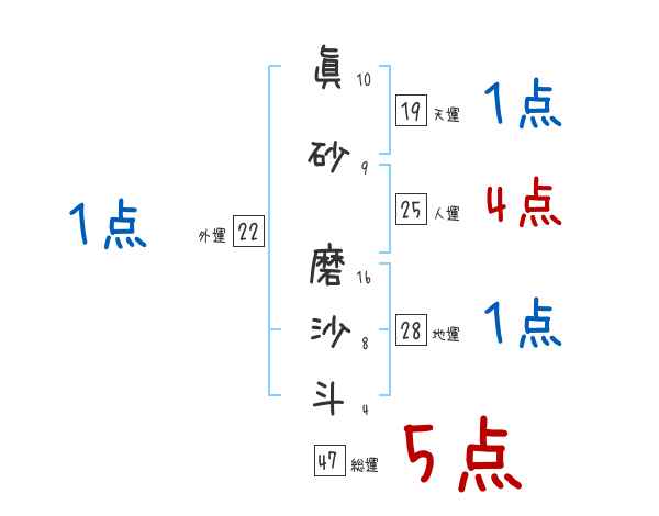 天運![]() | 眞砂磨沙斗さんの天運は19画の1つ星!優れた才能を持ちますが、協調性が足りないことも。周りの人と協力する事を意識しましょう。 家系が持つ宿命的な運勢を表します。祖先から受け継いだ苗字ですので自分の力が及びません。家柄を象徴します。 |