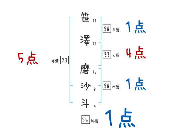 総運![]() | 笹澤磨沙斗さんの総運は56画の1つ星!消極的で無気力になりがち。誠実な気持ちが必要でしょう。 あなたの人生を表す1番重要な運勢です。生涯を通じて影響する総合運となり、主に50歳以降の晩年期に影響を及ぼします。 |