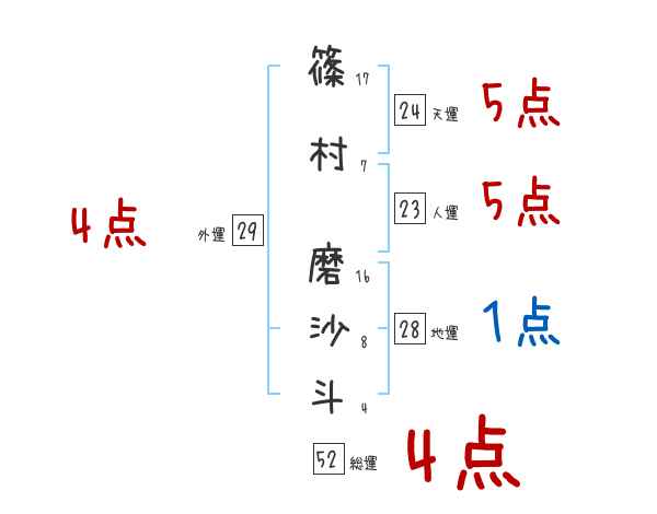 人運![]() | 篠村磨沙斗さんの人運は23画の5つ星!想像力に優れ活力がある。一代で成功し名誉を手に入れる。 性格や才能などを表す2番目に重要な運勢です。人間関係や協調性、社会的な成功に影響します。主に20歳から50歳ぐらいまでの中年期の運勢を表します。 |