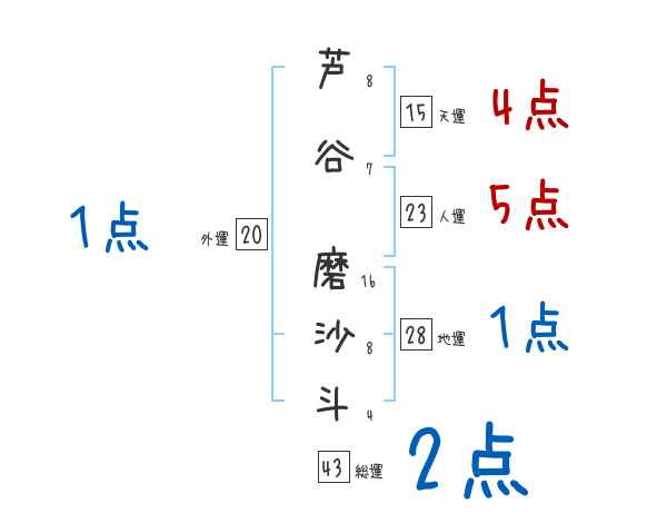 人運![]() | 芦谷磨沙斗さんの人運は23画の5つ星!想像力に優れ活力がある。一代で成功し名誉を手に入れる。 性格や才能などを表す2番目に重要な運勢です。人間関係や協調性、社会的な成功に影響します。主に20歳から50歳ぐらいまでの中年期の運勢を表します。 |