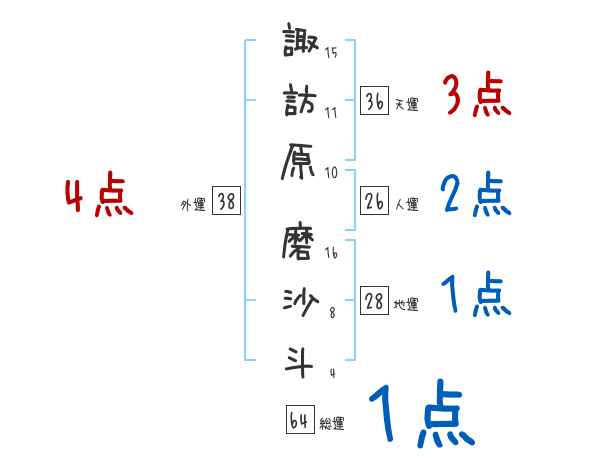 天運![]() | 諏訪原磨沙斗さんの天運は36画の3つ星!先見性が豊かです。多少神経質で苦労することも。 家系が持つ宿命的な運勢を表します。祖先から受け継いだ苗字ですので自分の力が及びません。家柄を象徴します。 |