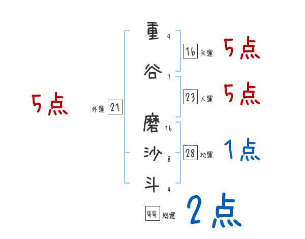 天運![]() | 重谷磨沙斗さんの天運は16画の5つ星!人望が厚く大きく発展する。逆転成功が見える。 家系が持つ宿命的な運勢を表します。祖先から受け継いだ苗字ですので自分の力が及びません。家柄を象徴します。 |