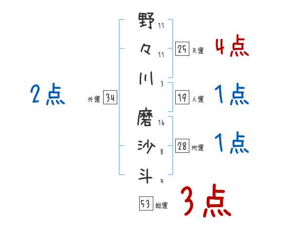 野々川磨沙斗さんの画数の鑑定結果