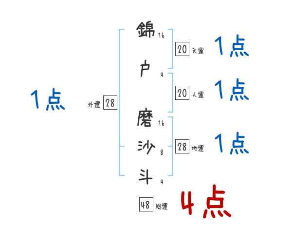 地運![]() | 錦戸磨沙斗さんの地運は28画の1つ星!家庭環境に注意。スポーツで活躍できる能力があるかも。 個性を表す基礎的な運勢です。性格形成や対人関係、行動力など家庭環境に影響されます。主に誕生してから20歳くらいまでの若年期の運勢を表します。 |