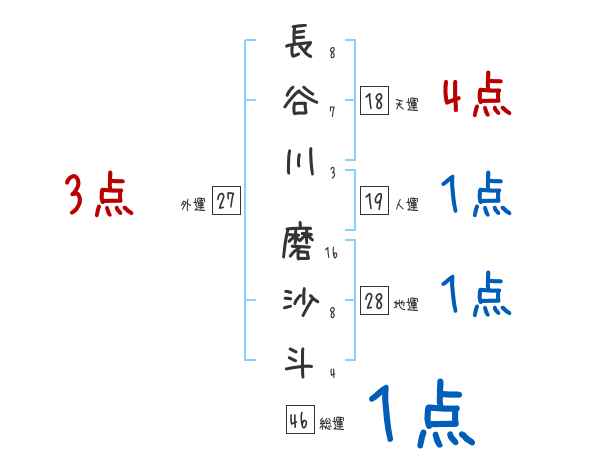 | 天運  | 長谷川磨沙斗さんの天運は18画の4つ星!情熱的で剛気。忍耐力があり信頼される。家系が持つ宿命的な運勢を表します。祖先から受け継いだ苗字ですので自分の力が及びません。家柄を象徴します。 |