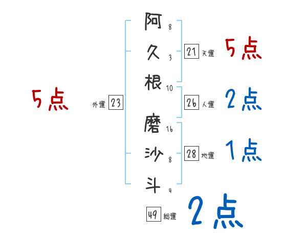 天運![]() | 阿久根磨沙斗さんの天運は21画の5つ星!統率力がある。独立し成功する。名誉を手に入れる。 家系が持つ宿命的な運勢を表します。祖先から受け継いだ苗字ですので自分の力が及びません。家柄を象徴します。 |
