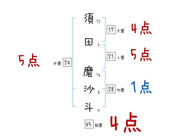 外運![]() | 須田磨沙斗さんの外運は24画の5つ星!家庭運が良く順調な人生。金運にも恵まれる。 生活面を象徴する運勢です。外部から受ける影響力を表し、結婚運、家庭運や職場、環境への順応性を表します。 |
