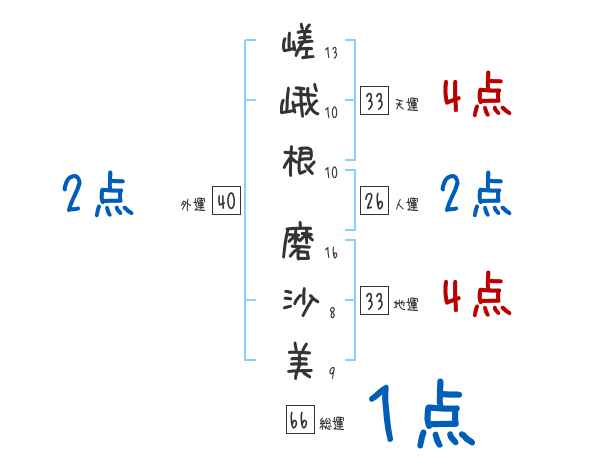 天運![]() | 嵯峨根磨沙美さんの天運は33画の4つ星!権力志向でプライドが高い。勇気があり運を切り開き成功する。 家系が持つ宿命的な運勢を表します。祖先から受け継いだ苗字ですので自分の力が及びません。家柄を象徴します。 |