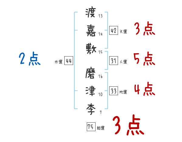 総運![]() | 渡嘉敷磨津李さんの総運は75画の3つ星!慎重な性格で保守的。 あなたの人生を表す1番重要な運勢です。生涯を通じて影響する総合運となり、主に50歳以降の晩年期に影響を及ぼします。 |
