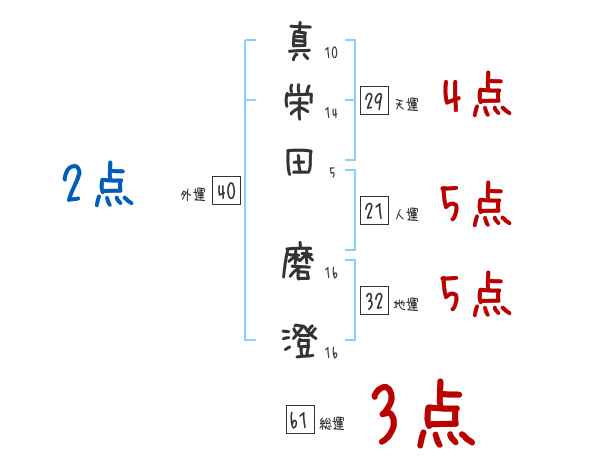 地運![]() | 真栄田磨澄さんの地運は32画の5つ星!柔軟性があり成功する。チャンスが多く金運が良い。 個性を表す基礎的な運勢です。性格形成や対人関係、行動力など家庭環境に影響されます。主に誕生してから20歳くらいまでの若年期の運勢を表します。 |