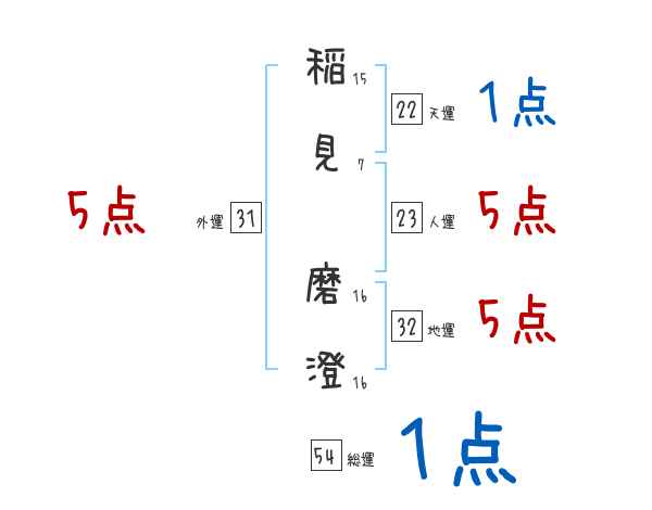 天運![]() | 稲見磨澄さんの天運は22画の1つ星!努力することが苦手ないっぽう手先が器用。芸術性にも優れる。 家系が持つ宿命的な運勢を表します。祖先から受け継いだ苗字ですので自分の力が及びません。家柄を象徴します。 |