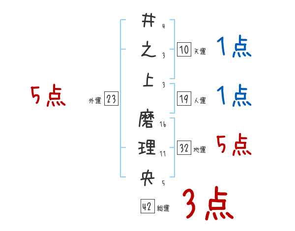 地運![]() | 井之上磨理央さんの地運は32画の5つ星!柔軟性があり成功する。チャンスが多く金運が良い。 個性を表す基礎的な運勢です。性格形成や対人関係、行動力など家庭環境に影響されます。主に誕生してから20歳くらいまでの若年期の運勢を表します。 |