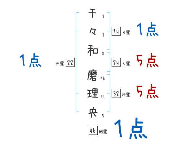 総運![]() | 千々和磨理央さんの総運は46画の1つ星!迷走することが多く苦労するかも。目先のことにとらわれないように。 あなたの人生を表す1番重要な運勢です。生涯を通じて影響する総合運となり、主に50歳以降の晩年期に影響を及ぼします。 |