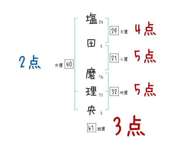 地運![]() | 塩田磨理央さんの地運は32画の5つ星!柔軟性があり成功する。チャンスが多く金運が良い。 個性を表す基礎的な運勢です。性格形成や対人関係、行動力など家庭環境に影響されます。主に誕生してから20歳くらいまでの若年期の運勢を表します。 |