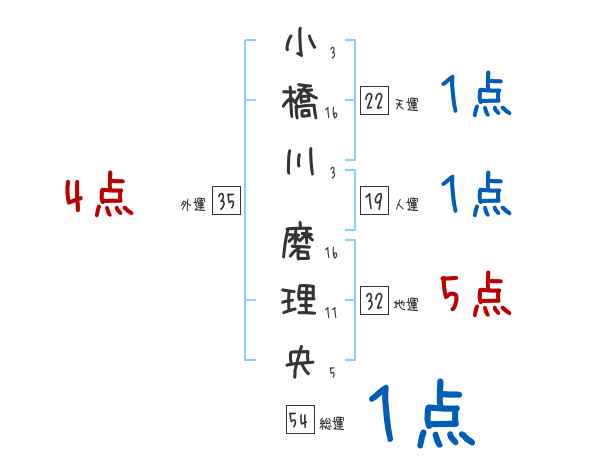 外運![]() | 小橋川磨理央さんの外運は35画の4つ星!温厚な性格で感受性が高い。穏和な性格で人望が厚い。 生活面を象徴する運勢です。外部から受ける影響力を表し、結婚運、家庭運や職場、環境への順応性を表します。 |