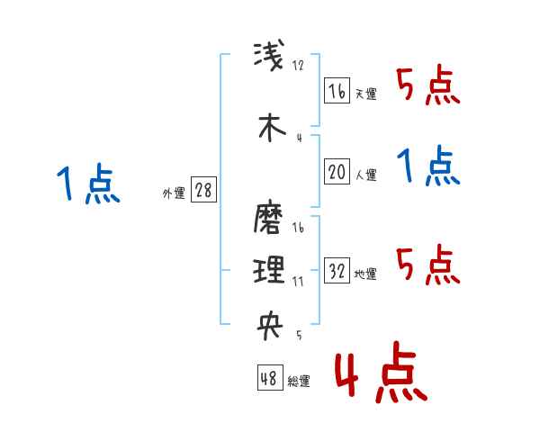 外運![]() | 浅木磨理央さんの外運は28画の1つ星!家庭環境に注意。スポーツで活躍できる能力があるかも。 生活面を象徴する運勢です。外部から受ける影響力を表し、結婚運、家庭運や職場、環境への順応性を表します。 |