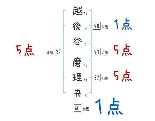地運![]() | 越後谷磨理央さんの地運は32画の5つ星!柔軟性があり成功する。チャンスが多く金運が良い。 個性を表す基礎的な運勢です。性格形成や対人関係、行動力など家庭環境に影響されます。主に誕生してから20歳くらいまでの若年期の運勢を表します。 |