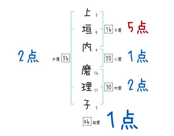 外運![]() | 上垣内磨理子さんの外運は26画の2つ星!波瀾万丈かも。信頼できる人を大事にしましょう。 生活面を象徴する運勢です。外部から受ける影響力を表し、結婚運、家庭運や職場、環境への順応性を表します。 |