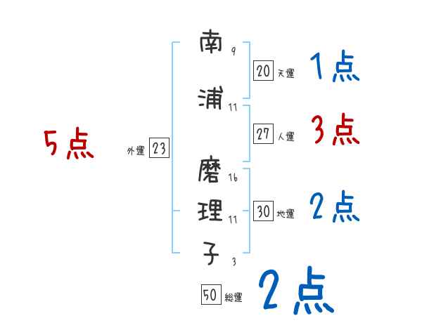 外運![]() | 南浦磨理子さんの外運は23画の5つ星!想像力に優れ活力がある。一代で成功し名誉を手に入れる。 生活面を象徴する運勢です。外部から受ける影響力を表し、結婚運、家庭運や職場、環境への順応性を表します。 |