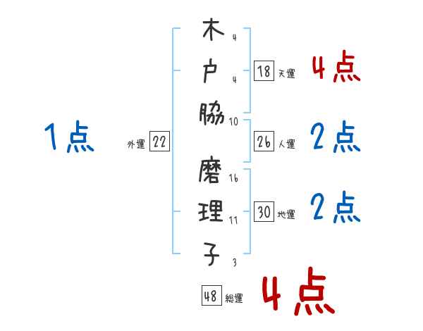 天運![]() | 木戸脇磨理子さんの天運は18画の4つ星!情熱的で剛気。忍耐力があり信頼される。 家系が持つ宿命的な運勢を表します。祖先から受け継いだ苗字ですので自分の力が及びません。家柄を象徴します。 |