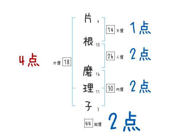 総運![]() | 片根磨理子さんの総運は44画の2つ星!誠実で慎重な性格。物事を考えすぎないように注意しましょう。 あなたの人生を表す1番重要な運勢です。生涯を通じて影響する総合運となり、主に50歳以降の晩年期に影響を及ぼします。 |