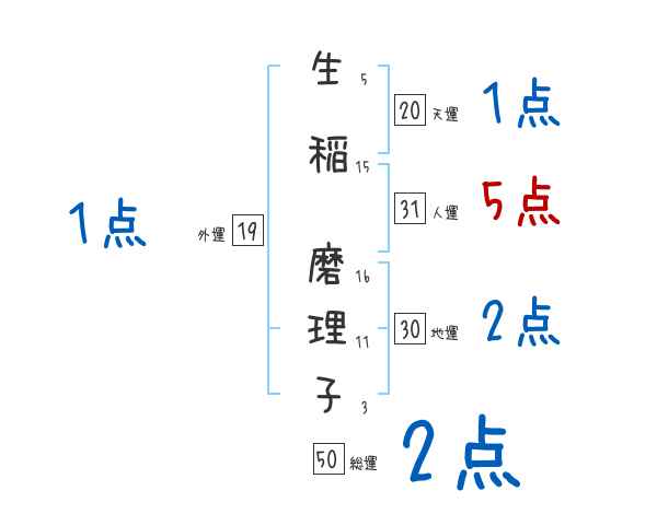 総運![]() | 生稲磨理子さんの総運は50画の2つ星!浮き沈みが激しく不安定。しりすぼみに衰退しやすいので注意しましょう。 あなたの人生を表す1番重要な運勢です。生涯を通じて影響する総合運となり、主に50歳以降の晩年期に影響を及ぼします。 |