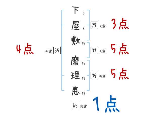 外運![]() | 下屋敷磨理恵さんの外運は35画の4つ星!温厚な性格で感受性が高い。穏和な性格で人望が厚い。 生活面を象徴する運勢です。外部から受ける影響力を表し、結婚運、家庭運や職場、環境への順応性を表します。 |