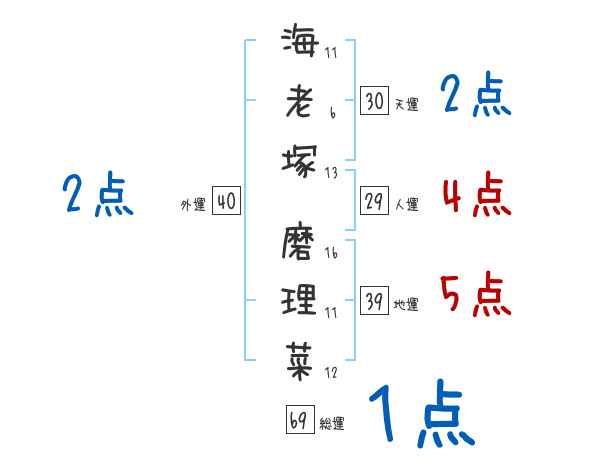 総運![]() | 海老塚磨理菜さんの総運は69画の1つ星!不満を感じやすい傾向が。ストレスを貯めないように注意しましょう。 あなたの人生を表す1番重要な運勢です。生涯を通じて影響する総合運となり、主に50歳以降の晩年期に影響を及ぼします。 |