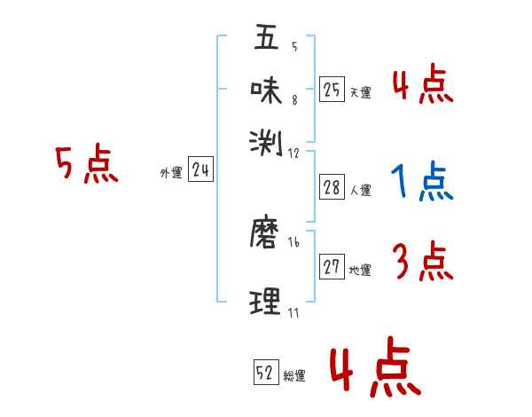 天運![]() | 五味渕磨理さんの天運は25画の4つ星!個性があり才能があふれる。強運の持ち主で発展する。 家系が持つ宿命的な運勢を表します。祖先から受け継いだ苗字ですので自分の力が及びません。家柄を象徴します。 |