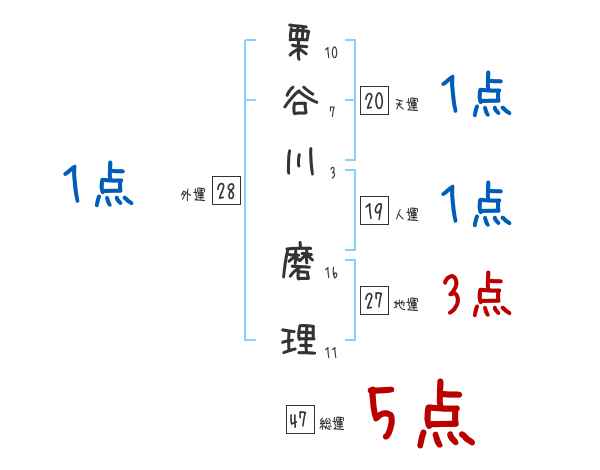外運![]() | 栗谷川磨理さんの外運は28画の1つ星!家庭環境に注意。スポーツで活躍できる能力があるかも。 生活面を象徴する運勢です。外部から受ける影響力を表し、結婚運、家庭運や職場、環境への順応性を表します。 |