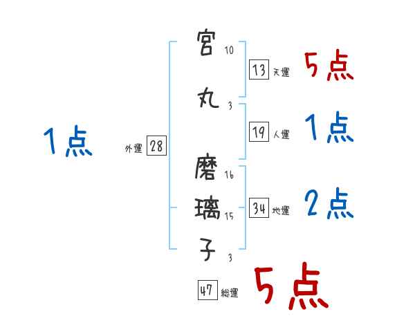 天運![]() | 宮丸磨璃子さんの天運は13画の5つ星!才能に恵まれ人気がある。名声を手に入れる。円満な人生。 家系が持つ宿命的な運勢を表します。祖先から受け継いだ苗字ですので自分の力が及びません。家柄を象徴します。 |
