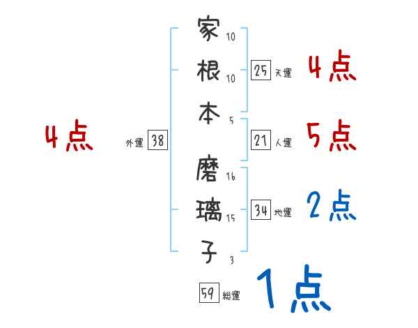 天運![]() | 家根本磨璃子さんの天運は25画の4つ星!個性があり才能があふれる。強運の持ち主で発展する。 家系が持つ宿命的な運勢を表します。祖先から受け継いだ苗字ですので自分の力が及びません。家柄を象徴します。 |