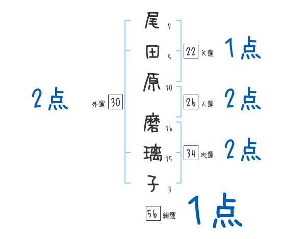 外運![]() | 尾田原磨璃子さんの外運は30画の2つ星!浮き沈みの激しさに注意しましょう。 生活面を象徴する運勢です。外部から受ける影響力を表し、結婚運、家庭運や職場、環境への順応性を表します。 |
