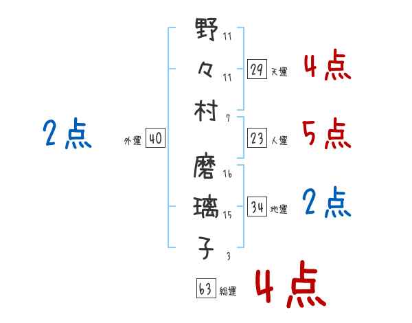 天運![]() | 野々村磨璃子さんの天運は29画の4つ星!完全主義で才能がある。厳格な心の持ち主。 家系が持つ宿命的な運勢を表します。祖先から受け継いだ苗字ですので自分の力が及びません。家柄を象徴します。 |
