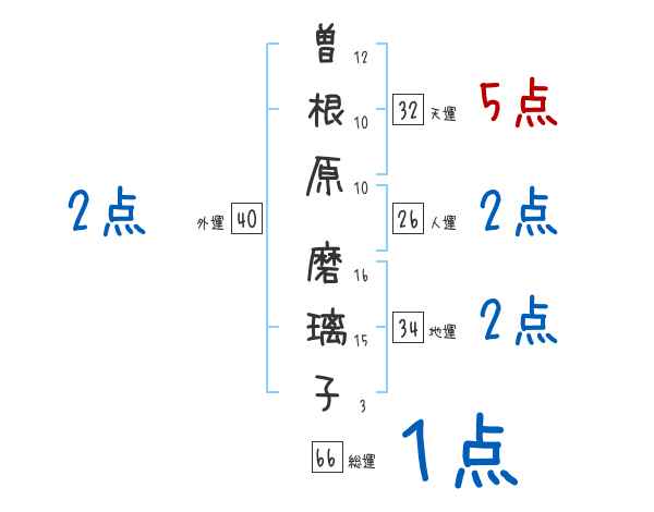 天運![]() | 曽根原磨璃子さんの天運は32画の5つ星!柔軟性があり成功する。チャンスが多く金運が良い。 家系が持つ宿命的な運勢を表します。祖先から受け継いだ苗字ですので自分の力が及びません。家柄を象徴します。 |