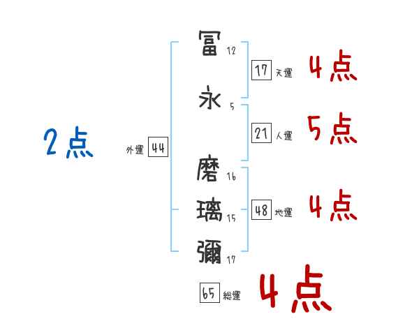 総運![]() | 冨永磨璃彌さんの総運は65画の4つ星!幸運に恵まれ繁栄する。包容力がある。 あなたの人生を表す1番重要な運勢です。生涯を通じて影響する総合運となり、主に50歳以降の晩年期に影響を及ぼします。 |