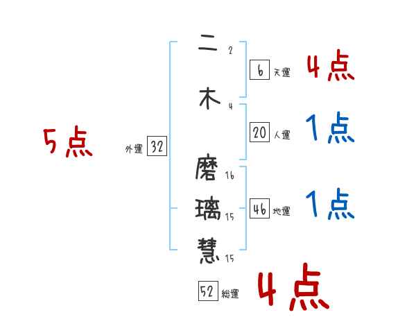外運![]() | 二木磨璃慧さんの外運は32画の5つ星!柔軟性があり成功する。チャンスが多く金運が良い。 生活面を象徴する運勢です。外部から受ける影響力を表し、結婚運、家庭運や職場、環境への順応性を表します。 |