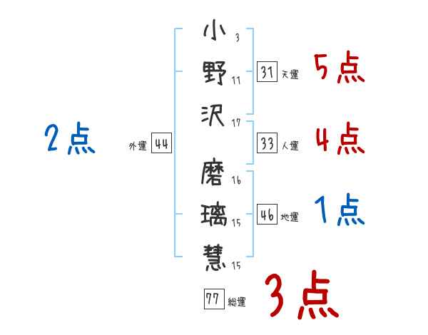 総運![]() | 小野沢磨璃慧さんの総運は77画の3つ星!多少不安定であるが晩年は吉。不屈の精神。 あなたの人生を表す1番重要な運勢です。生涯を通じて影響する総合運となり、主に50歳以降の晩年期に影響を及ぼします。 |